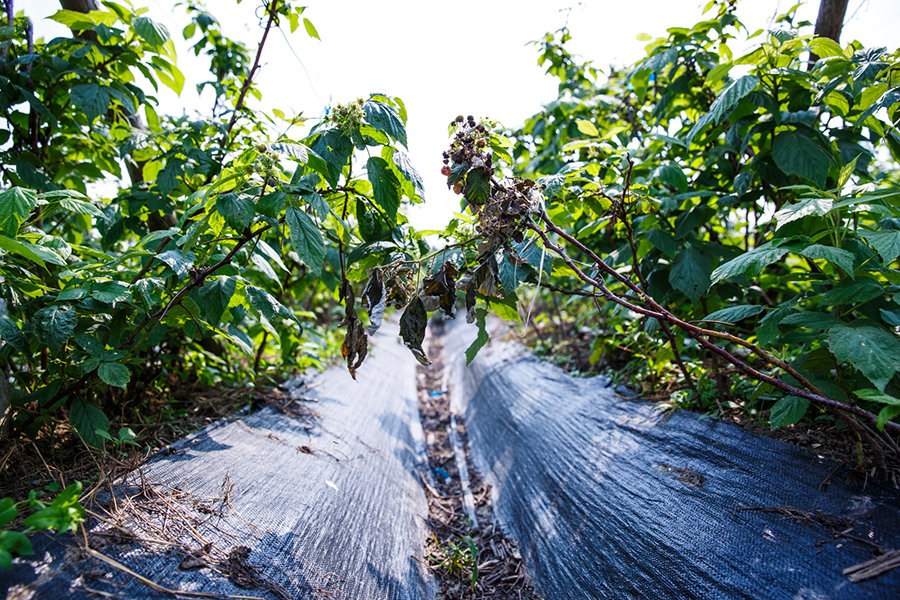 对于树莓生长过程中最怕的虫害危险,得益于整块地的生物多样性,一般两种办法可以解决,一种是生物防治,使用天然的杆菌制剂,放到喷雾剂里喷到叶子上,虫子碰到它就会生病,然后就是物理方法,用捕虫器等利用虫子对味道或光的敏感。